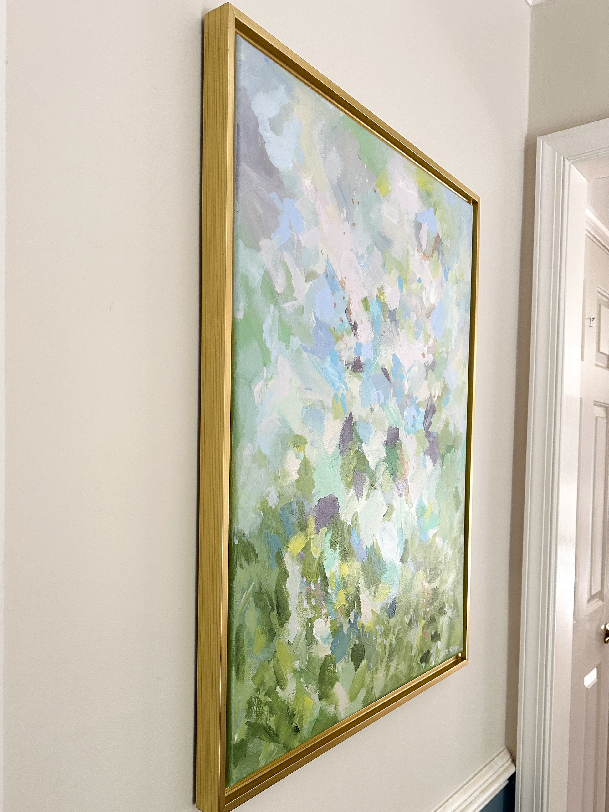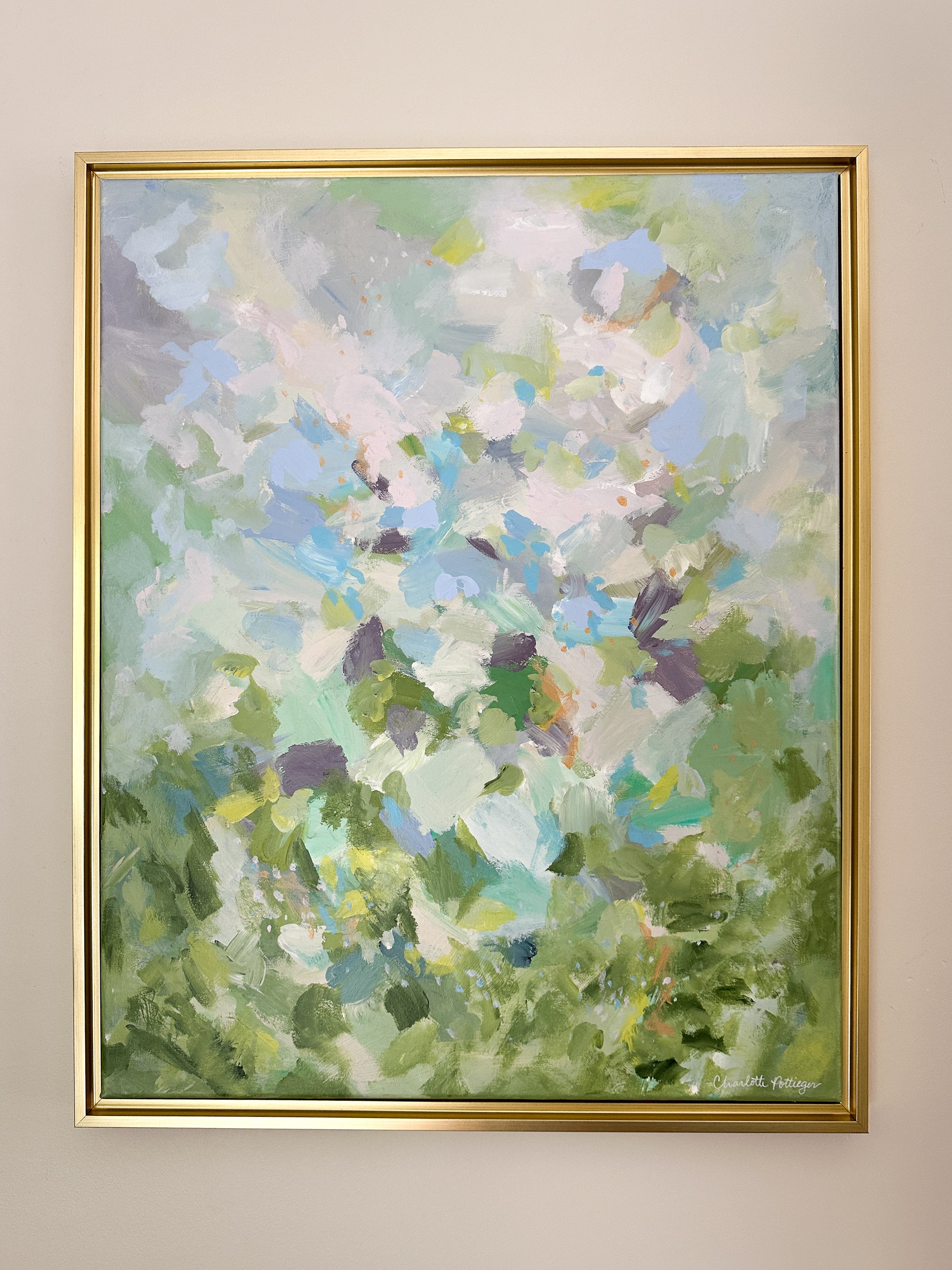 Acrylic on canvas, 28 x 24 inches, in a gold float frame.