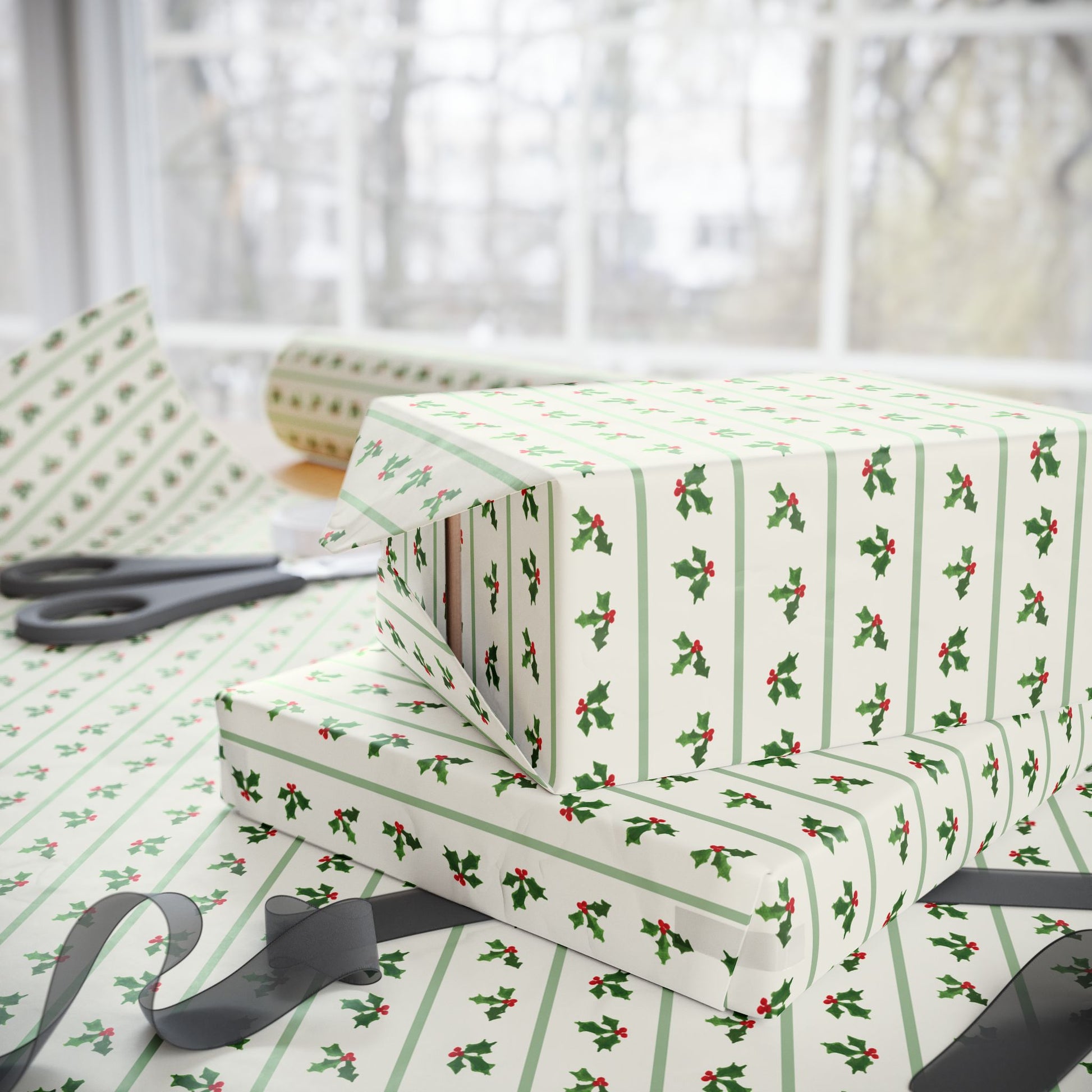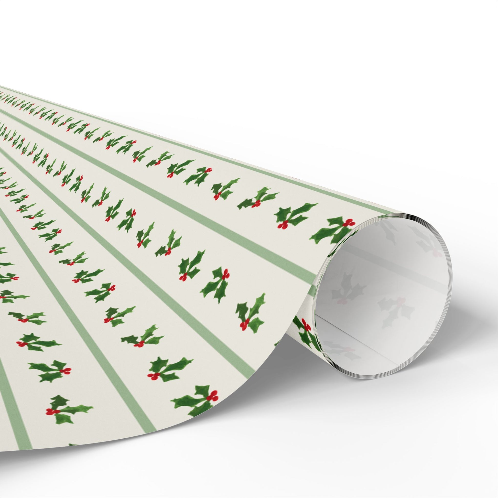 Wrap your gifts in timeless style with our Holly Stripe Wrapping Paper, featuring hand-painted holly leaves and berries on a soft vanilla cream background with sage green stripes. This classic, grandmillennial-inspired design brings a touch of traditional holiday charm to every package — perfect for Christmas, winter weddings, or thoughtful gifts all season long.