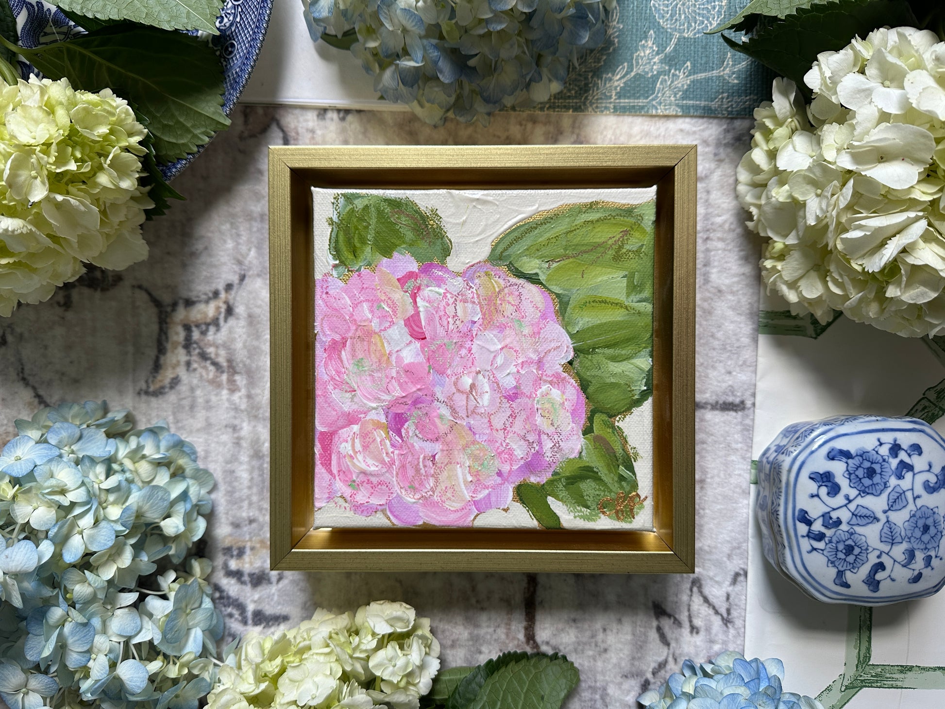 "Pink Hydrangea II" a 6x6 framed original painting by Charlotte Pottieger