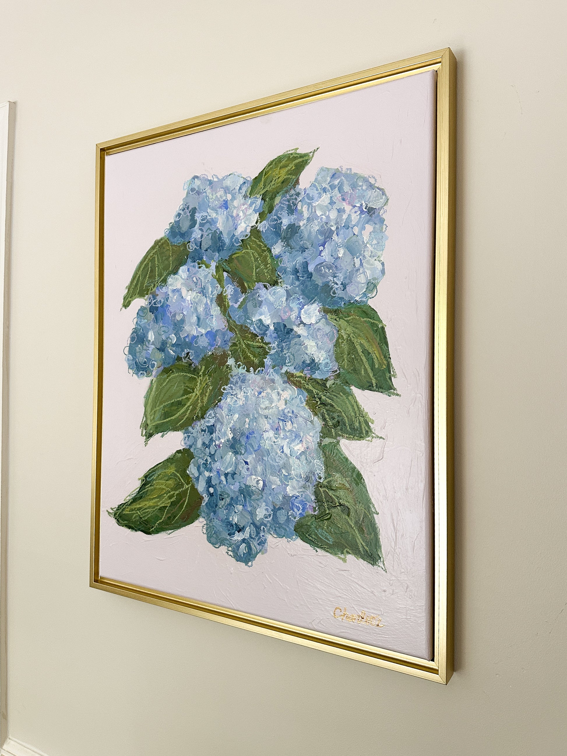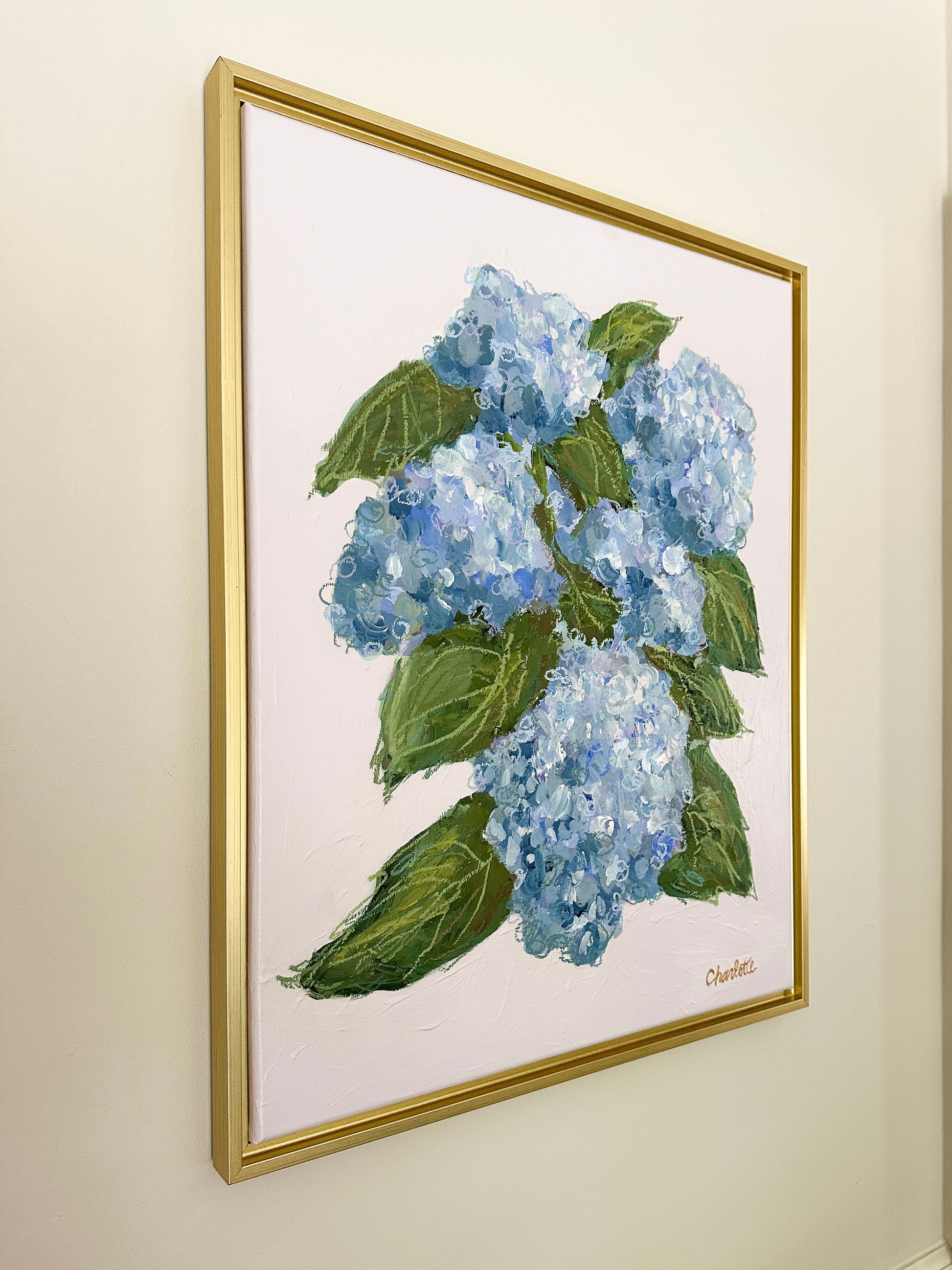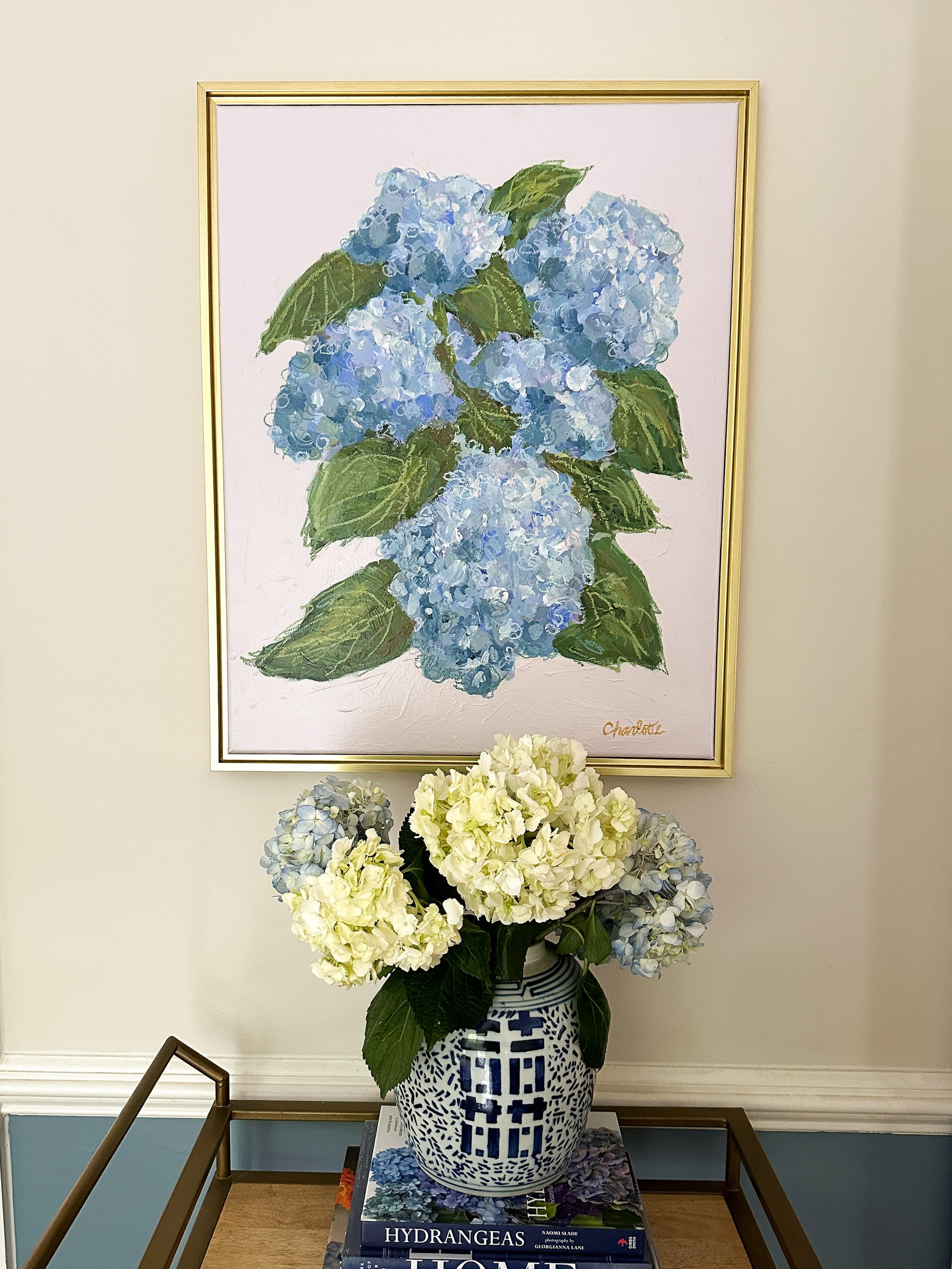 This was the very first painting in the Hydrangea Collection, inspired by a single potted plant that came home with me from North Carolina—despite an impending move. I couldn’t resist its charm, and now its soft, blooming presence lives on in this piece.