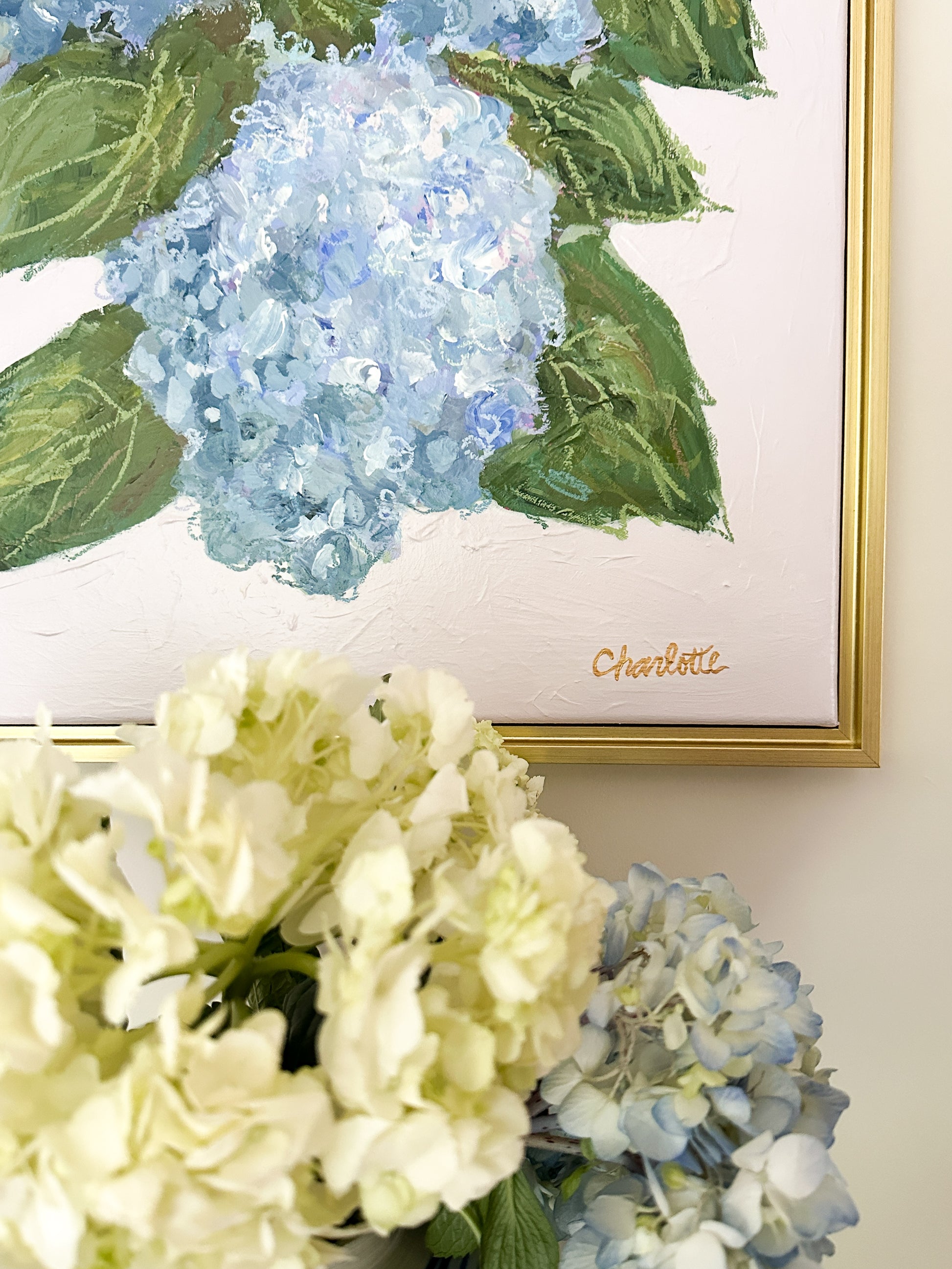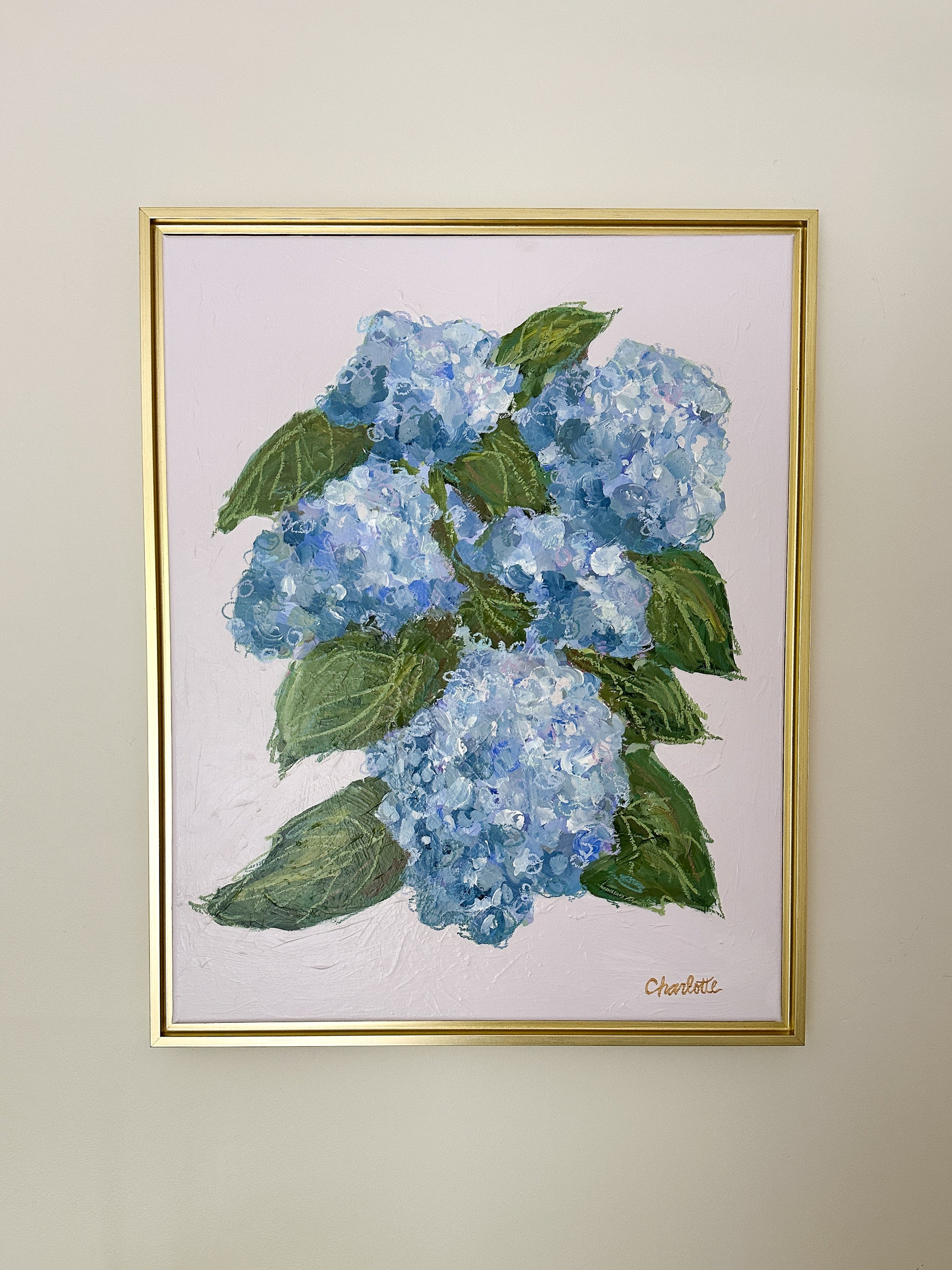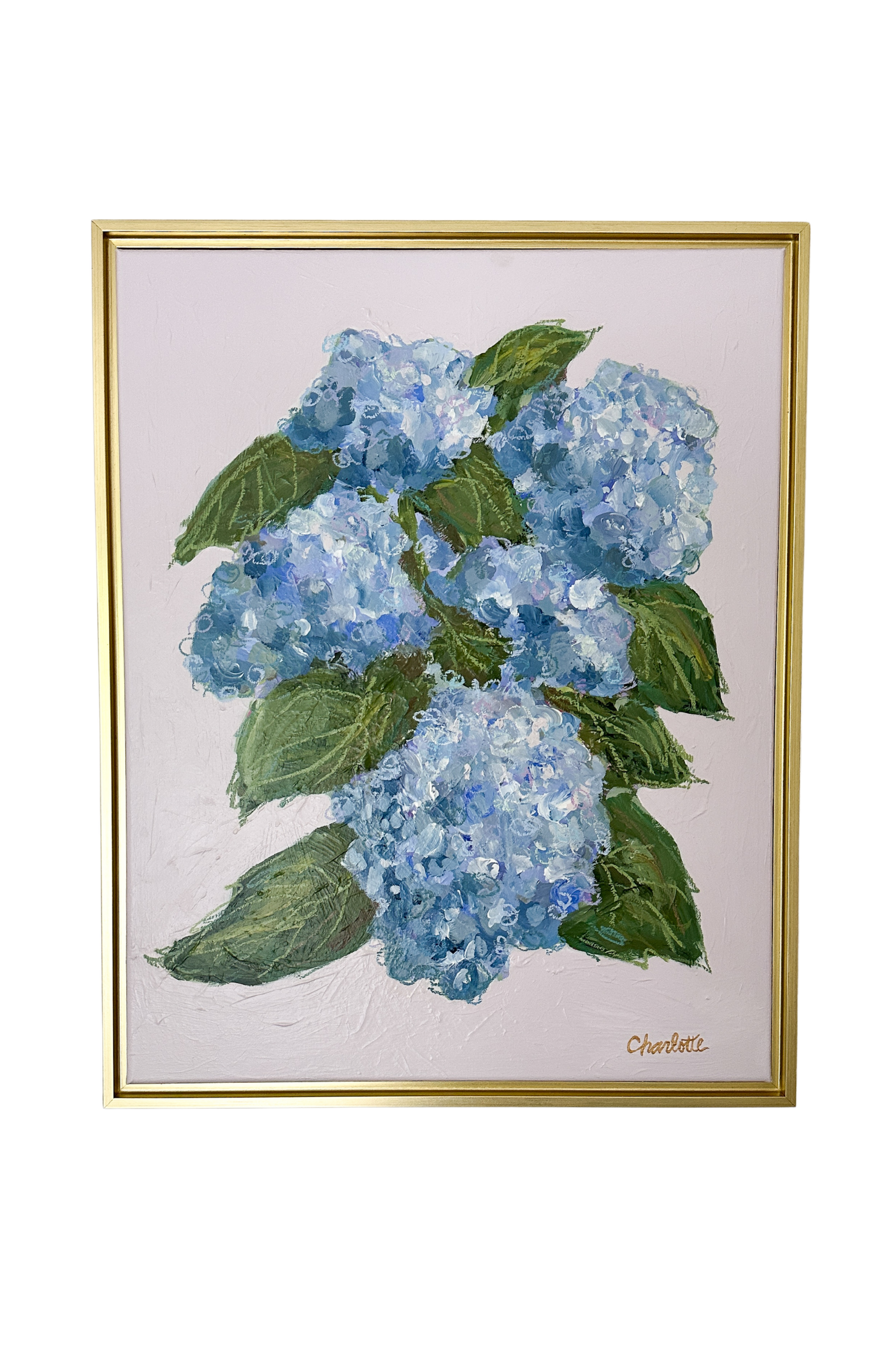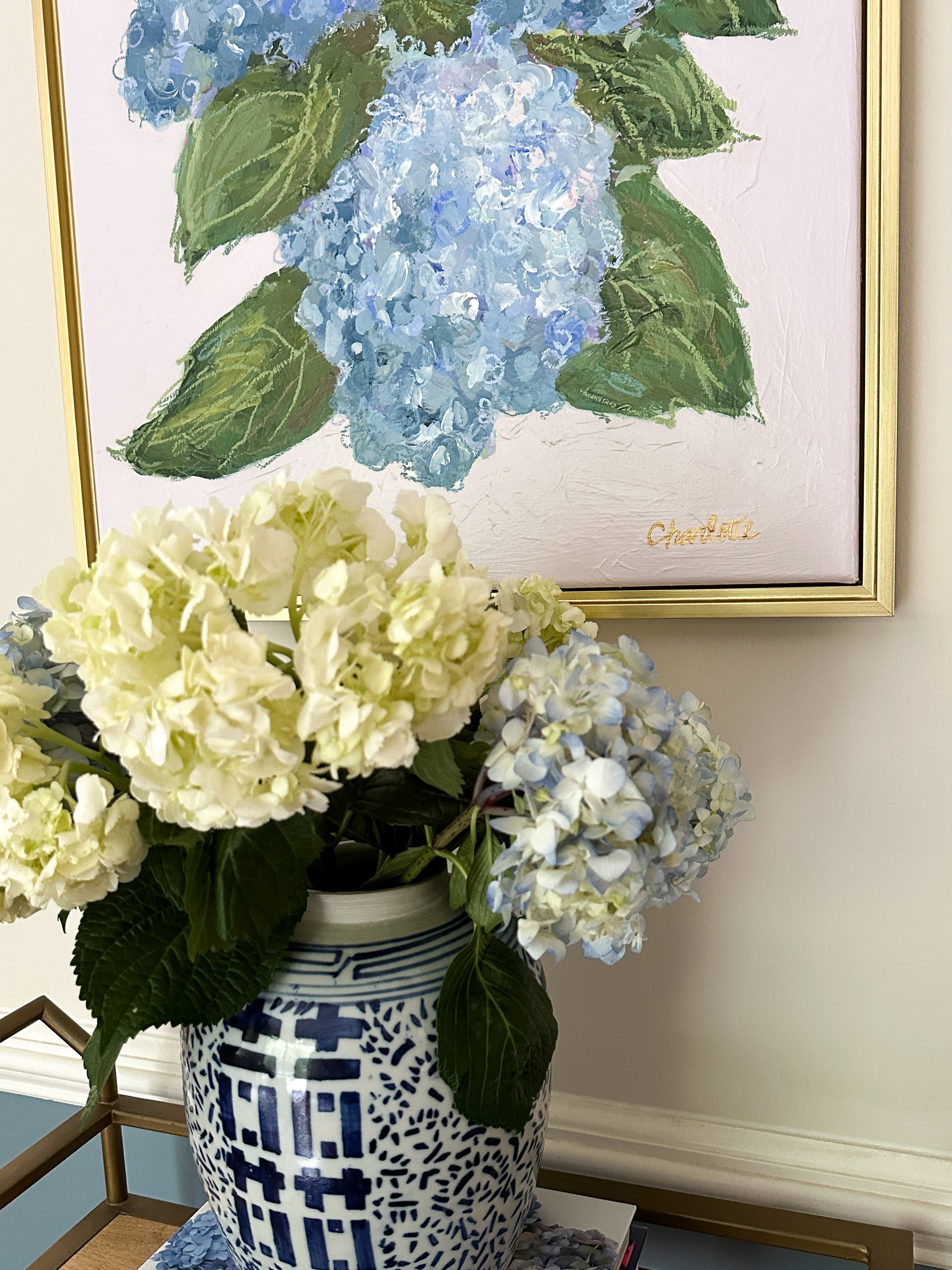 This was the very first painting in the Hydrangea Collection, inspired by a single potted plant that came home with me from North Carolina—despite an impending move. I couldn’t resist its charm, and now its soft, blooming presence lives on in this piece.